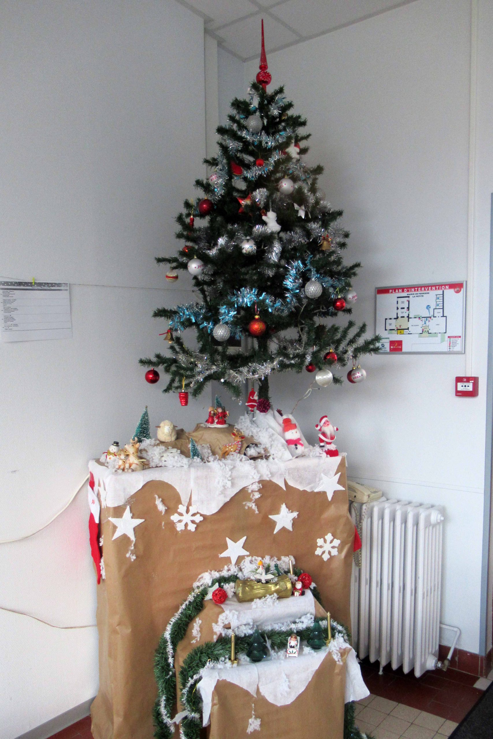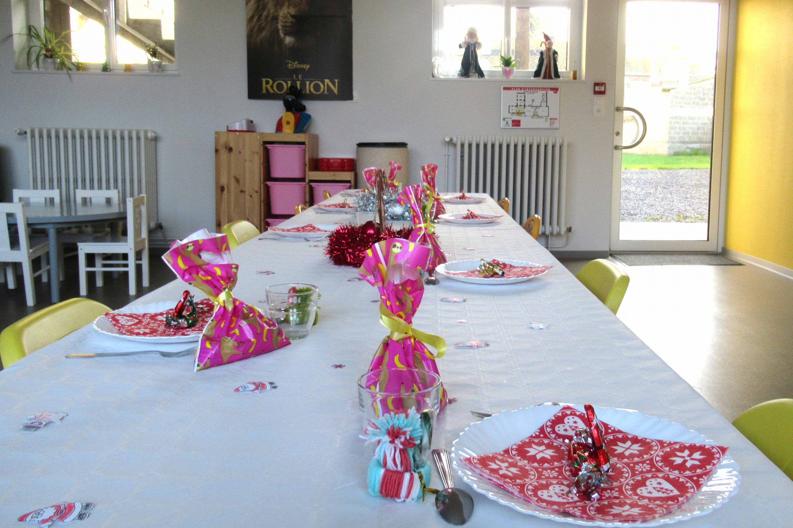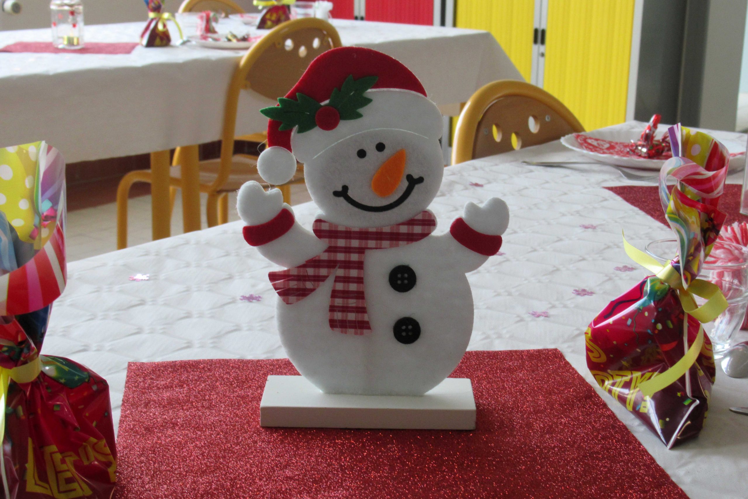 | Décoration de la cantine pour le repas de Noël Tables de fête, décorées par: Cathy, Anaïs et Aurélie. |