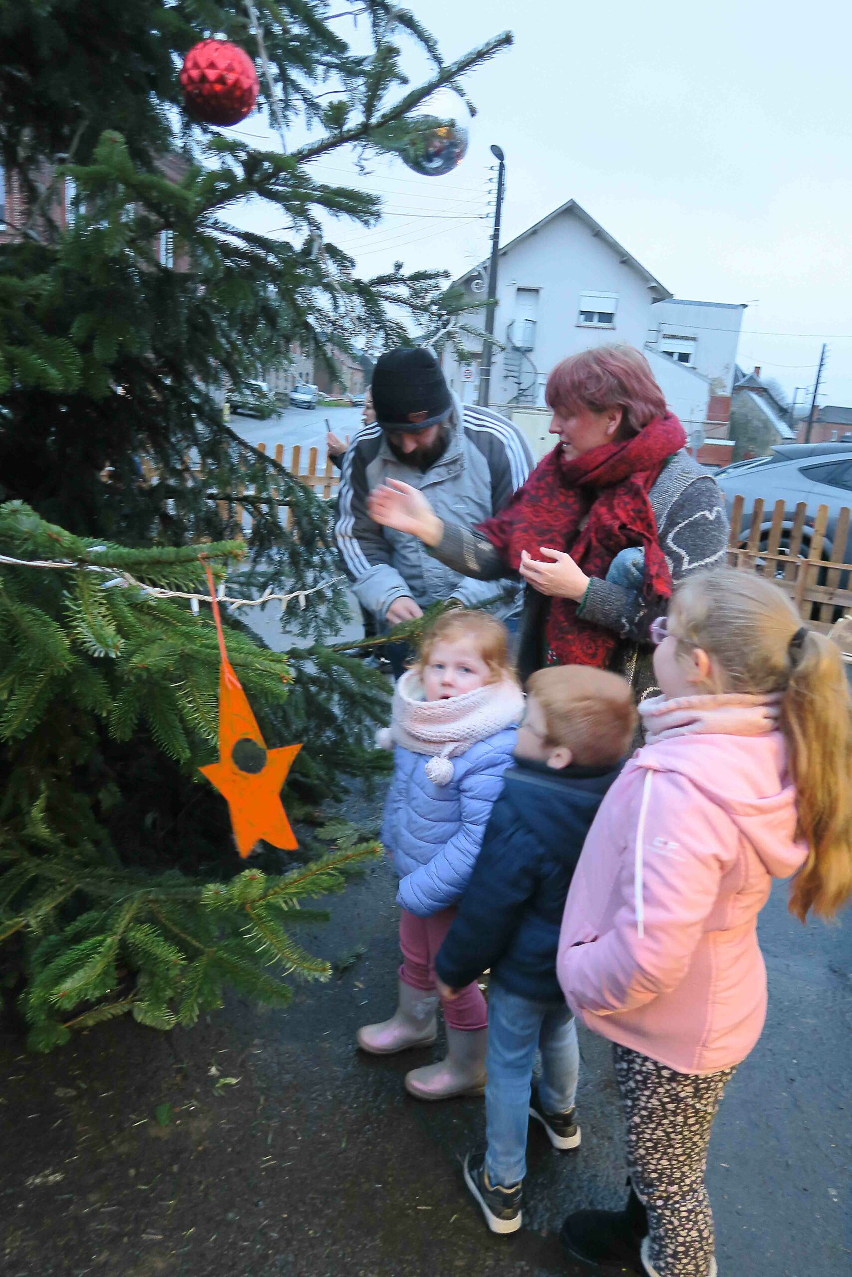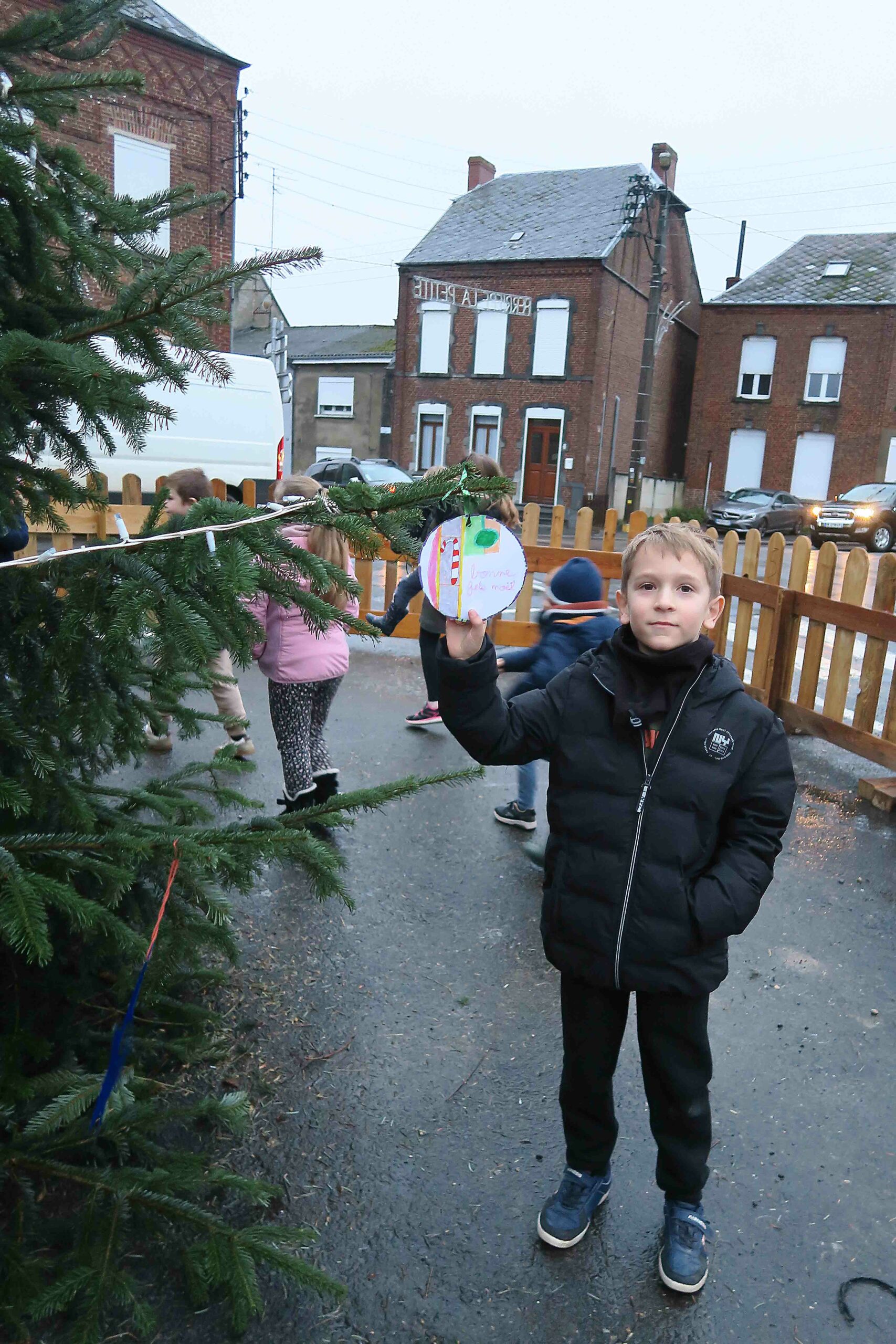 A la sortie de l’école, les enfants ont accroché au sapin de la place du village les décorations qu’ils avaient dessinées