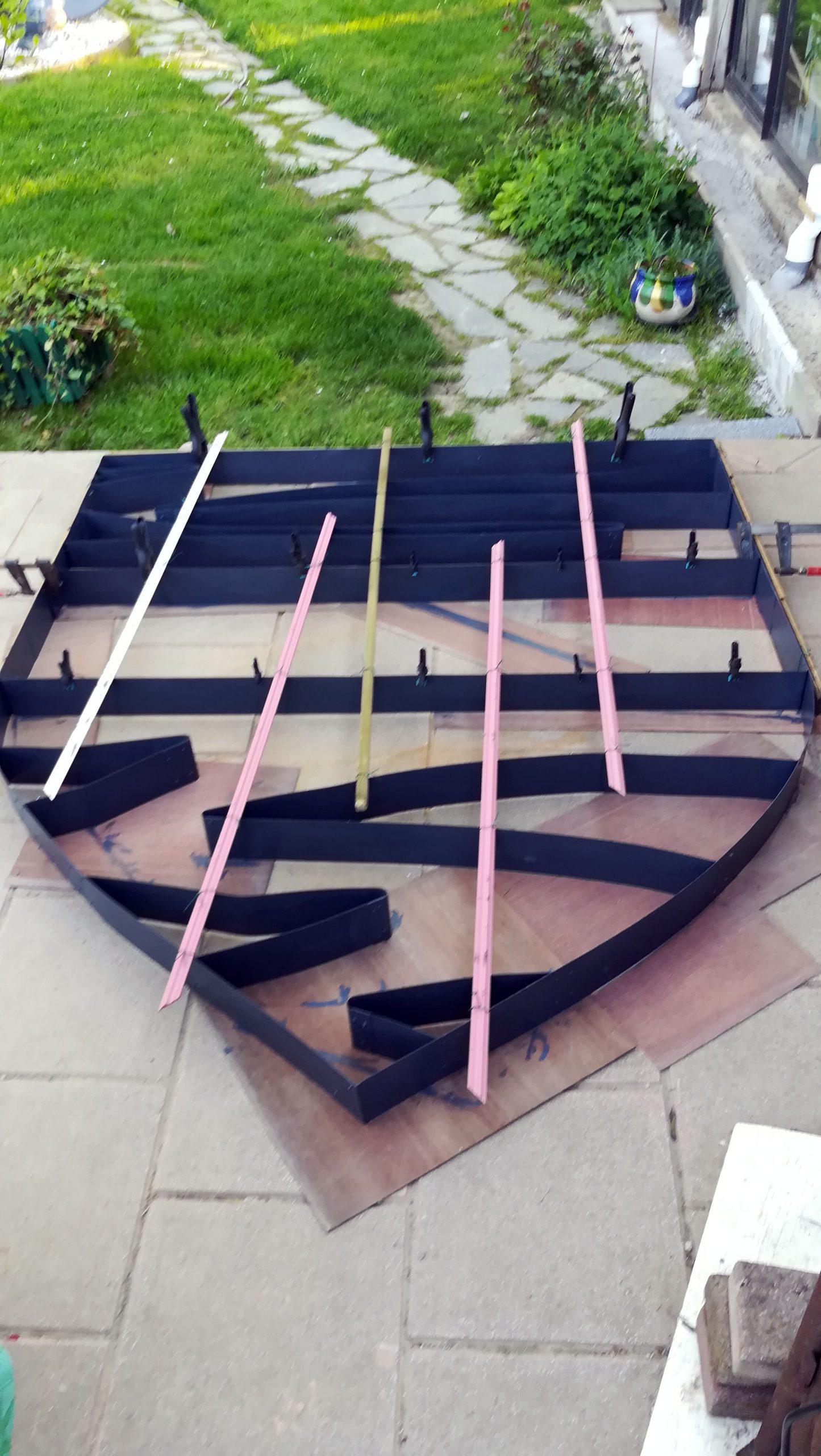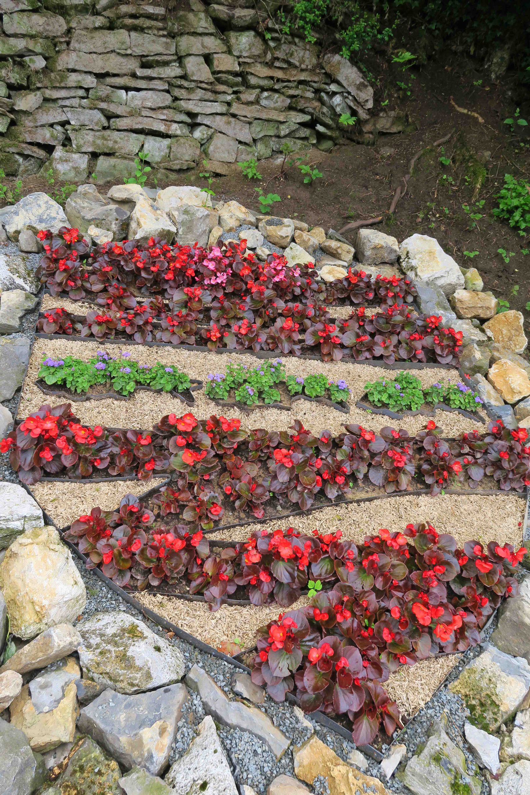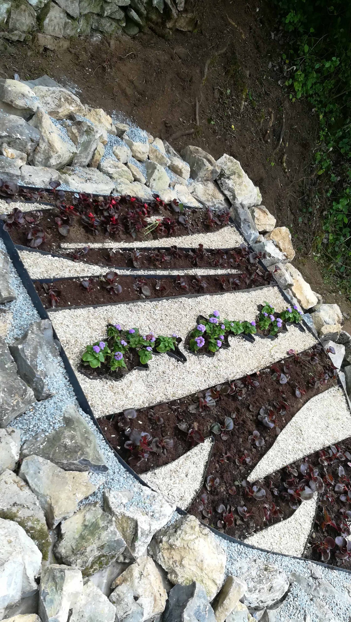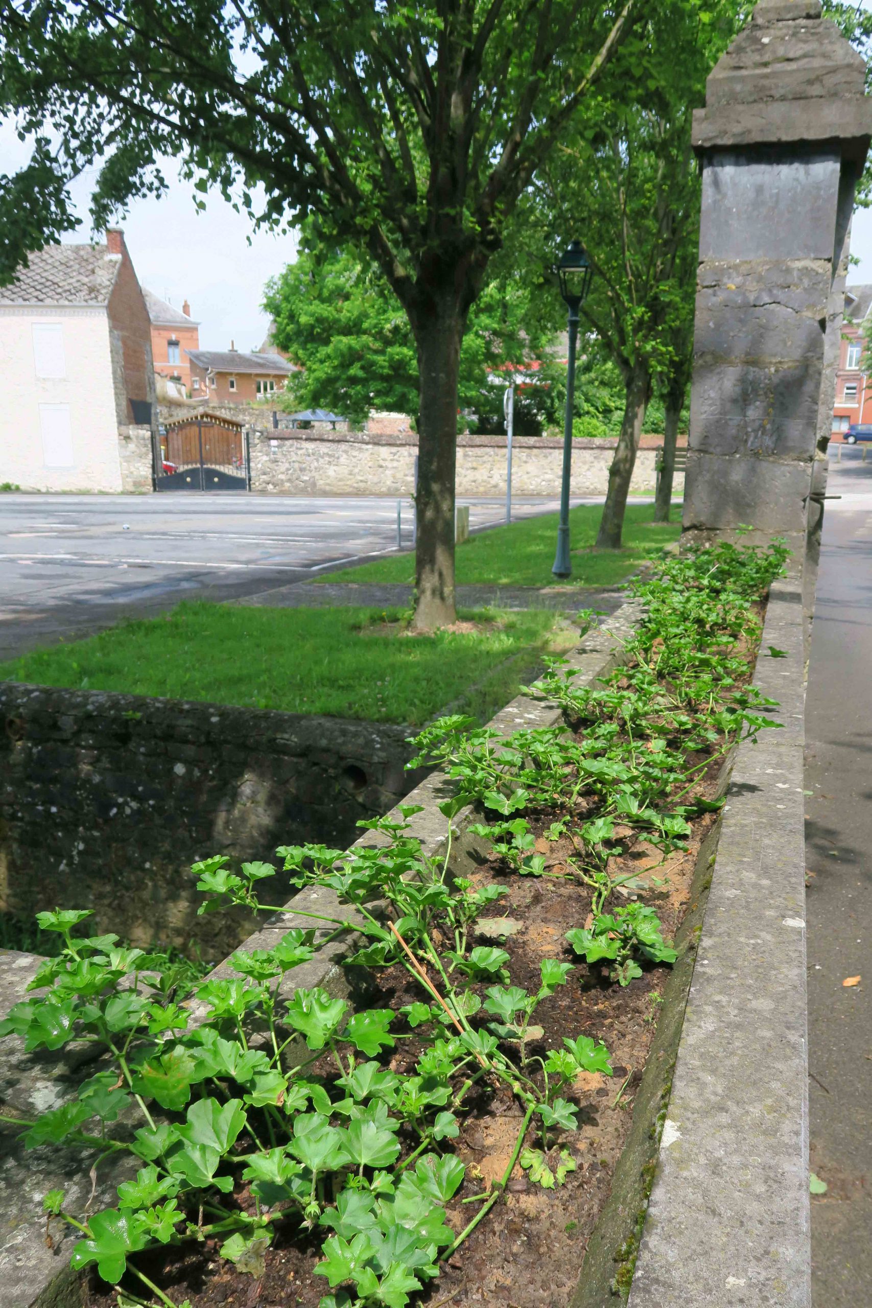 la plantation de géraniums sur le pont à l’entrée de la mairie